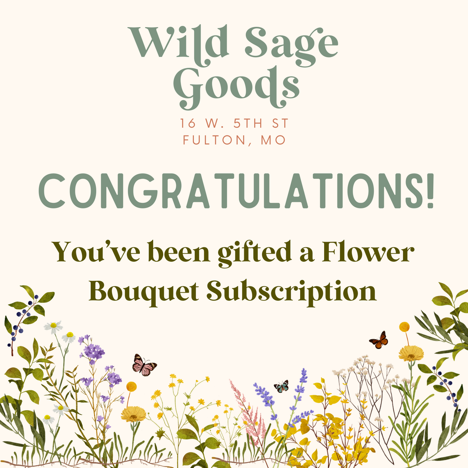 Pickup of the bouquet will be at the Wild Sage Goods store (16 W. 5th St, Fulton, Mo). Pick up days will be Wednesdays and Saturdays (you'll choose your preferred day).